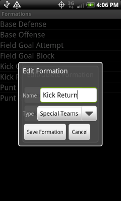 Formations: These are visual diagrams of players on the field on offense, defense and special teams. You can assign players to positions and you can drag positions around to create any formation you’d like. The app will start you off with a set of default formations. You can customize them as well as add new formations and delete existing ones.